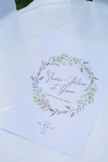 Outre le faire-part et les livrets de cérémonie, quelques articles sont venus compléter notre papeterie : - le plan de table et les menus : là aussi en papier kraft - le livre d’or, en papier kraft toujours - j’ai réalisé nos marques place sur des feuilles de tilleul de notre jardin.